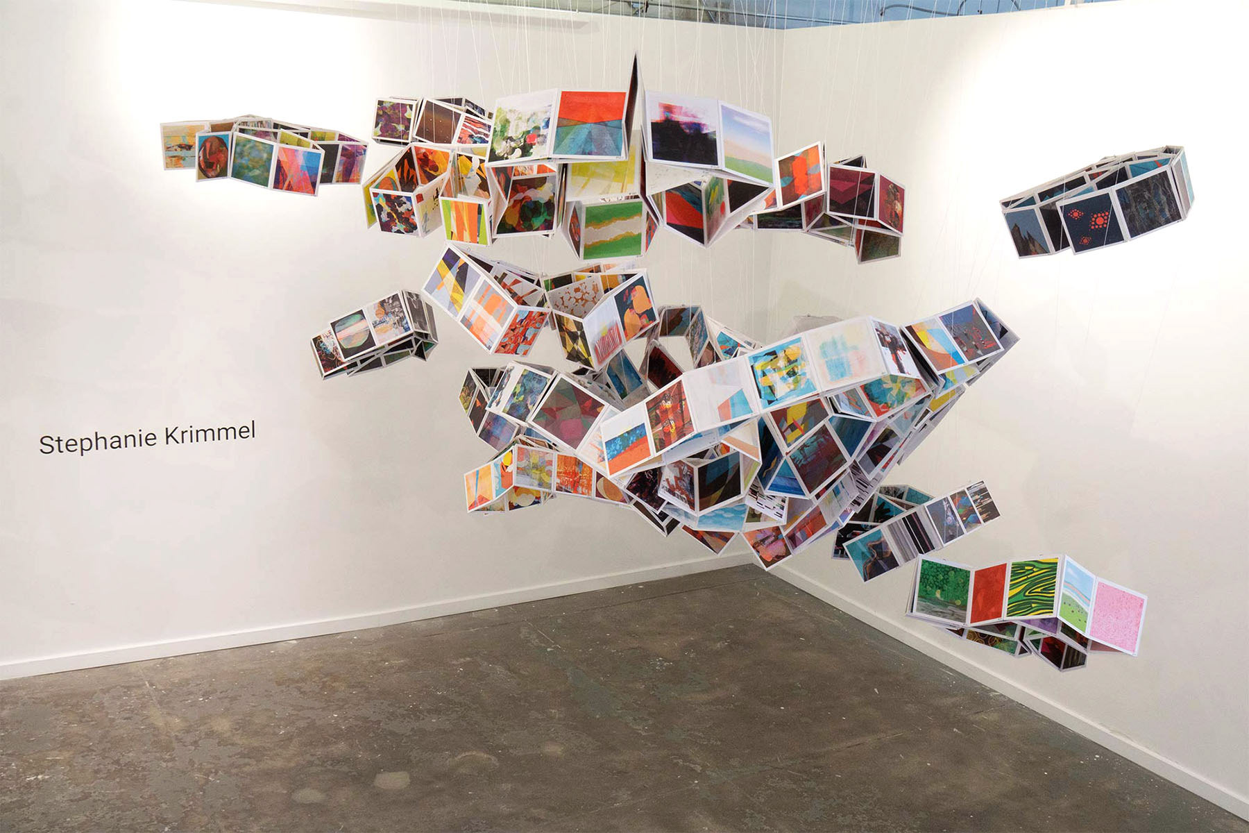 Mutation is created from approximately 1200 images from my daily digital painting series constructed as cellular 'pods' and suspended from the ceiling. Over time, the cellular structures became strained and changed their shapes. At the end of the exhibition, I cut them from their supports, allowing them to crash to the floor and creating a new arrangement, Mutation Aftermath.