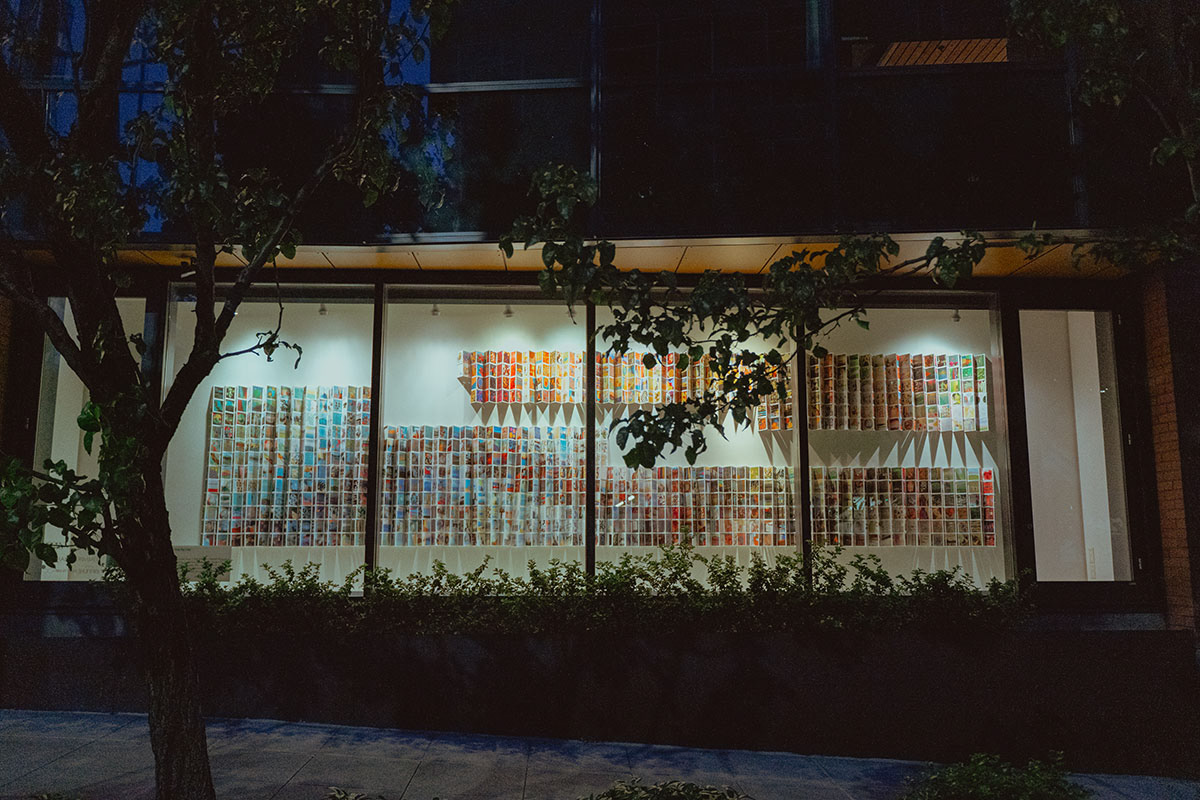 This installation is organized primarily by color. The works are printed as 4x4 inch postcards, sorted, and bound into accordion books of 8-12 cards each, which then are attached directly to the wall with map pins.